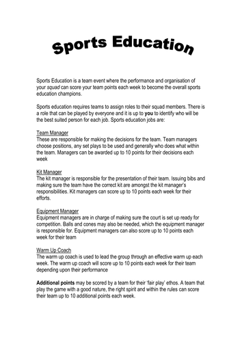 Basic Sports Education Team sheet & Roles | Teaching Resources